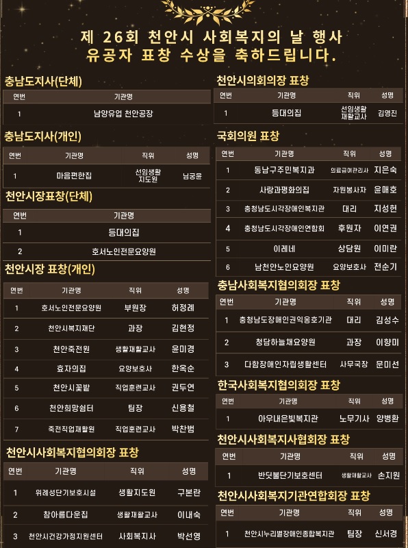 제 26회 천안시사회복지의 날 행사 유공자 표창수상 페이지 정보 작성자작성자 : 천사협 조회조회수 : 749회 작성일작성일 : 25-09-23 13:14 본문 수상을 축하 드립니다! 목록 다음글「제26회 천안시사회복지의 날 행사」사회복지 유공자 추천 협조 요청 25.07.28
